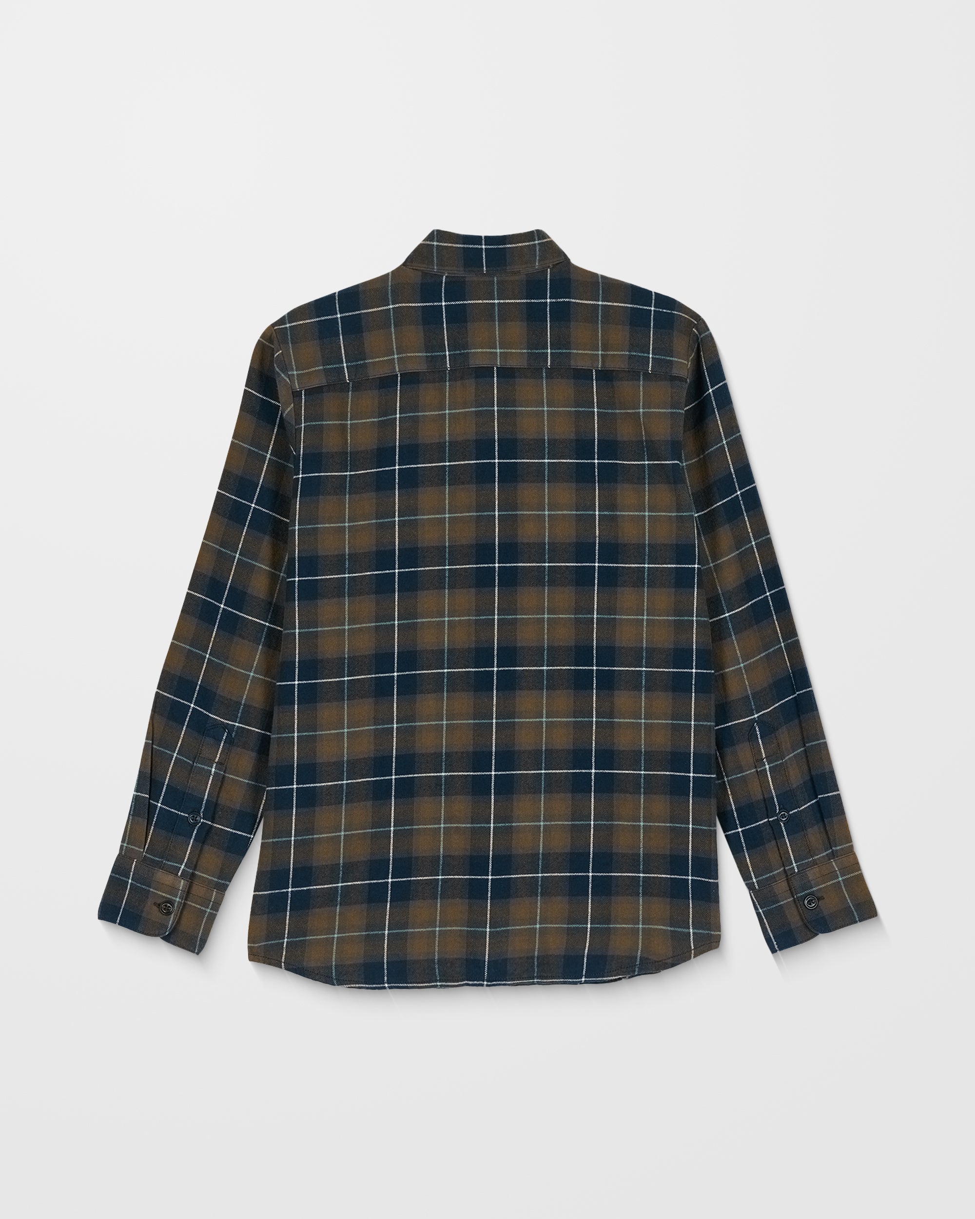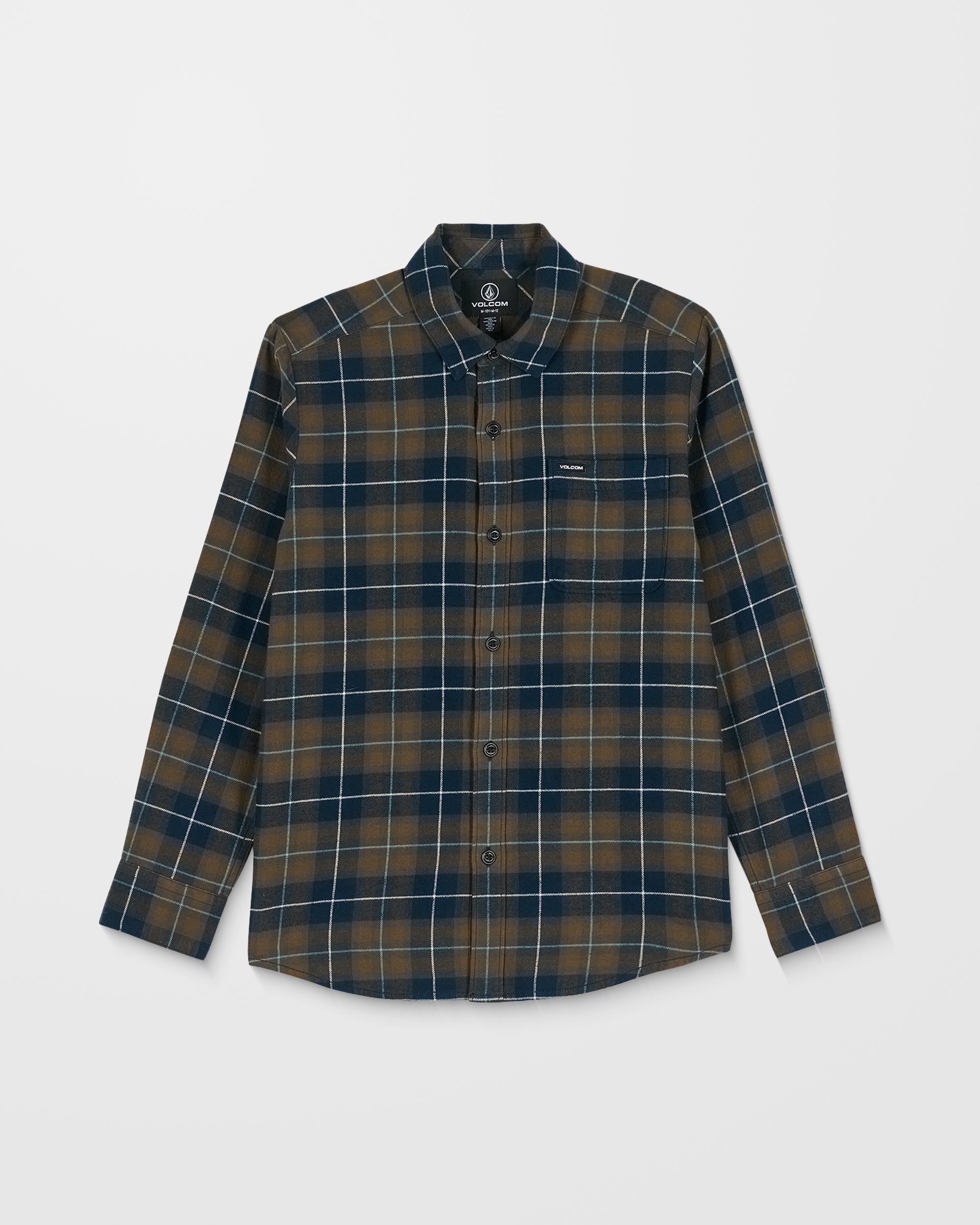 Meet the Caden Plaid LS: a navy plaid flannel that pulls its weight from coffee runs to last-call missions. Soft 100% cotton. yarn-dyed so the checks stay legit. in a classic fit that layers easy. Finished with a left chest pocket. Stone strip label. and the Volcom fisheye button that locks it down.