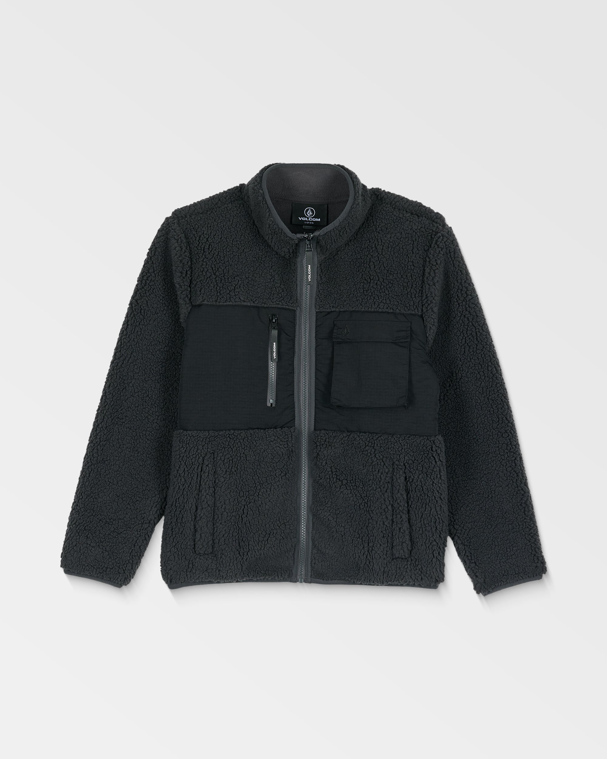 The Storm Stone Zip Fleece in Asphalt Black brings heavyweight sherpa warmth with a mock neck that blocks the bite. A ripstop front panel adds a flap pocket and zip stash. hand-warmer welts heat your paws. and a Stone patch seals the deal. with recycled fibers inside.