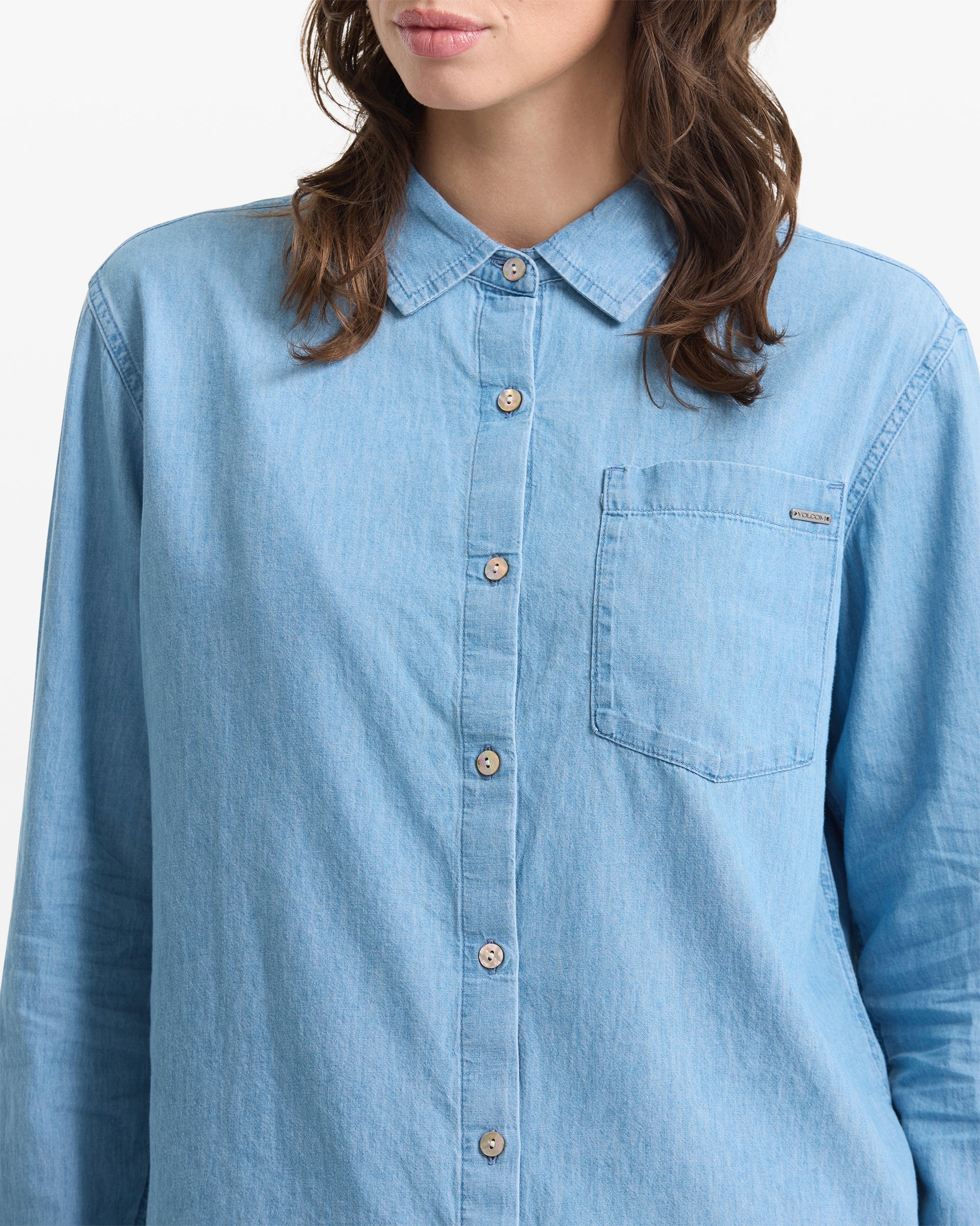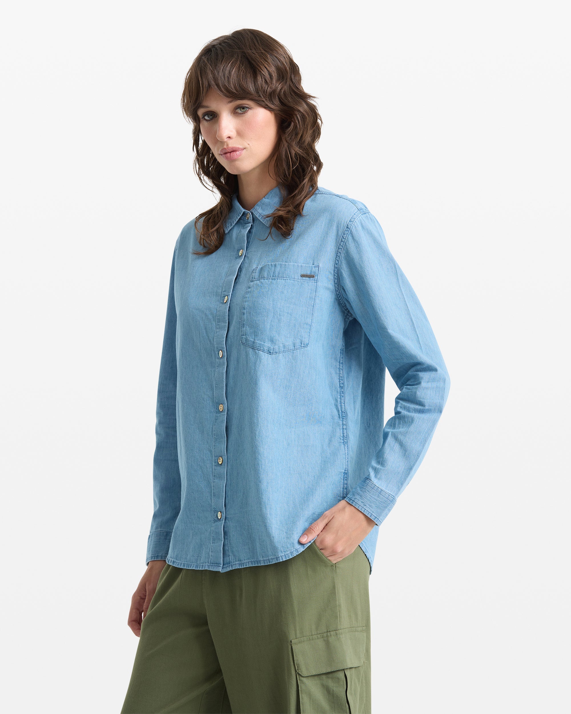 Quit stealing his; this chambray is yours. From our Lived In Lounge collection. the Lived In Button Up is cut oversized in 100% cotton chambray with a scalloped high-low hem that swings just right. A dropped chest pocket with metal badge. classic collar and button cuffs keep it clean. comfy and down for couch hangs or city runs.