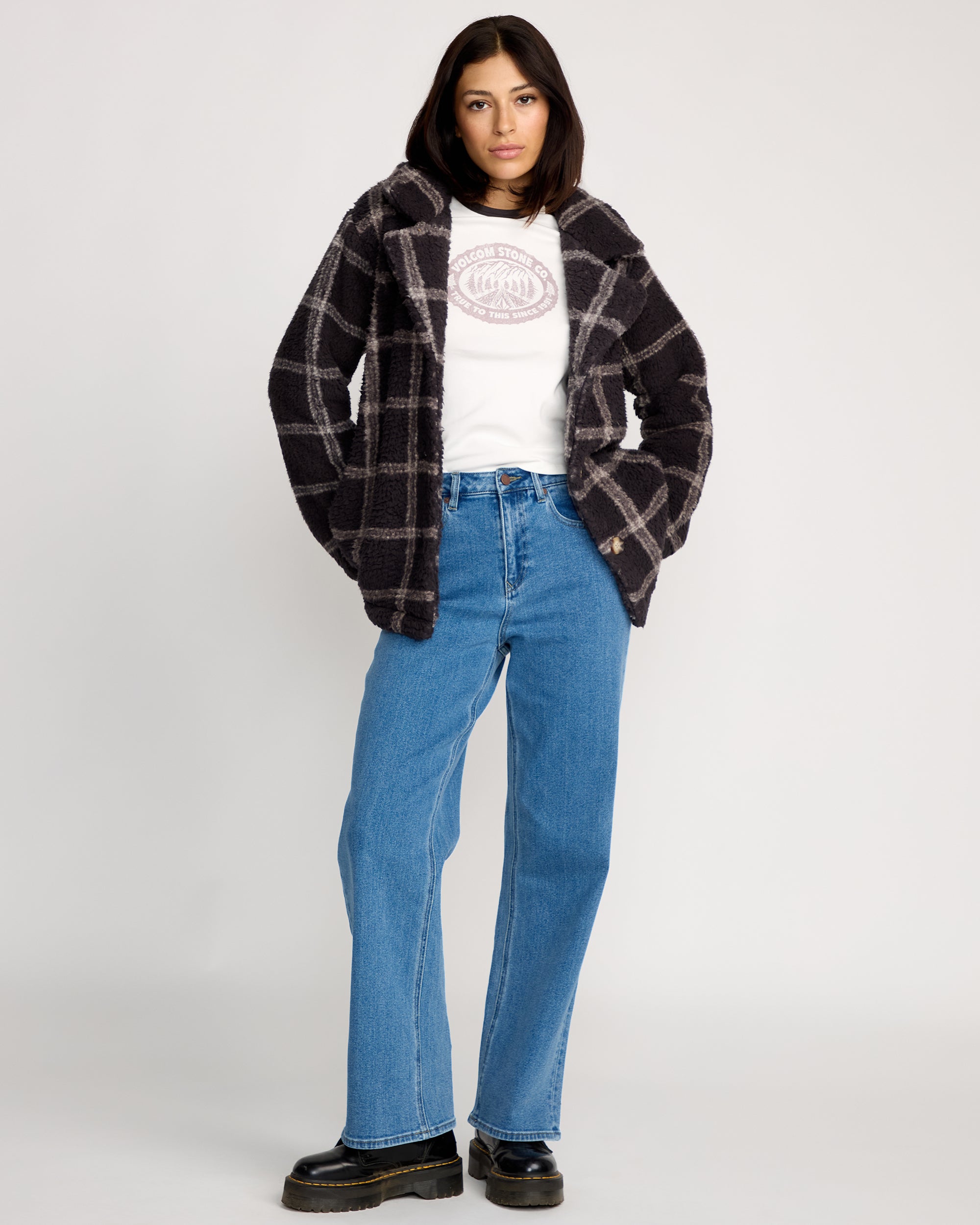 The Polar Puff Jacket in Vintage Black wraps you in allover plaid jacquard polar sherpa with a clean collar and lapel. oversized tortoiseshell buttons. and stealth side-seam pockets. A metal badge stamps it Volcom. HPS 28 inches for just-right coverage. soft. bold. and ready for the daily grind.