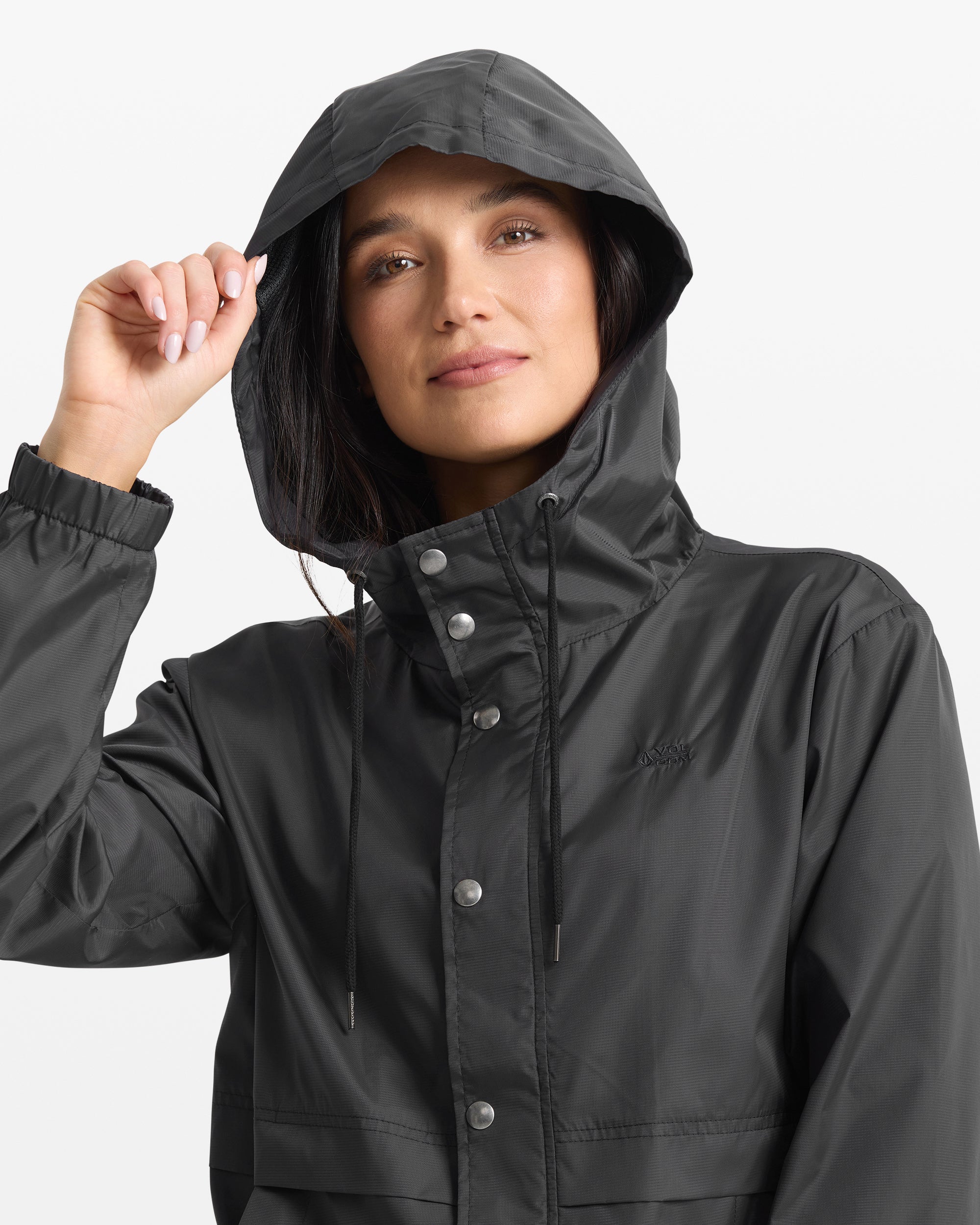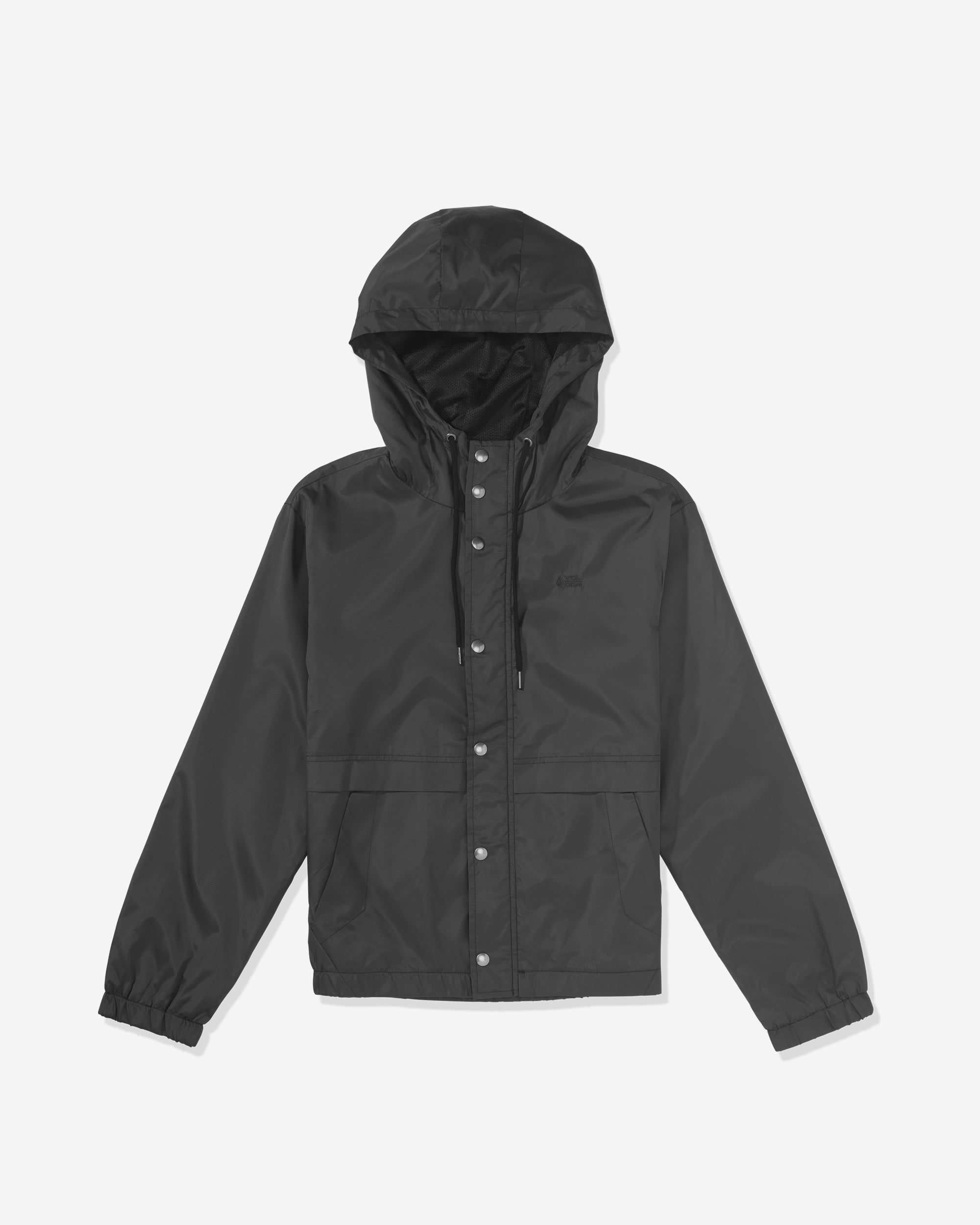 The Stonewind Jacket in Vintage Black pairs a 1000mm coated taffeta shell with breathable mesh lining. a hood and zip front. Elastic waist holds tight. lower pockets rock Stone seaming. and chest embroidery keeps it classic. Your new go-to Volcom windbreaker for unpredictable days.