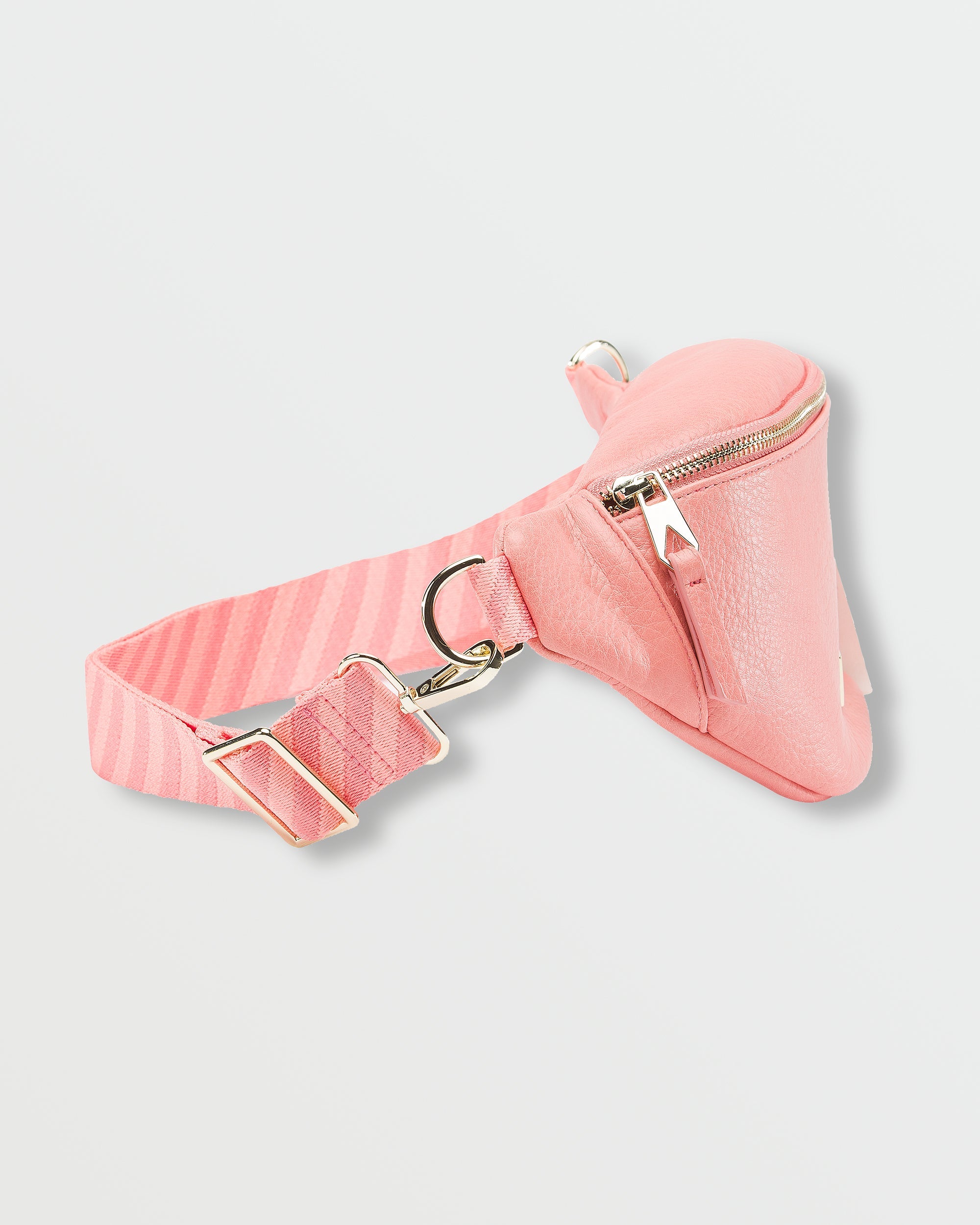 Elevated finishes and a textured Vegan Leather body material give this waistpack serious lux vibes. A metal zipper opens a large main compartment. The adjustable waist strap is also removable with metal clips. A debossed metal badge puts it all over the top.