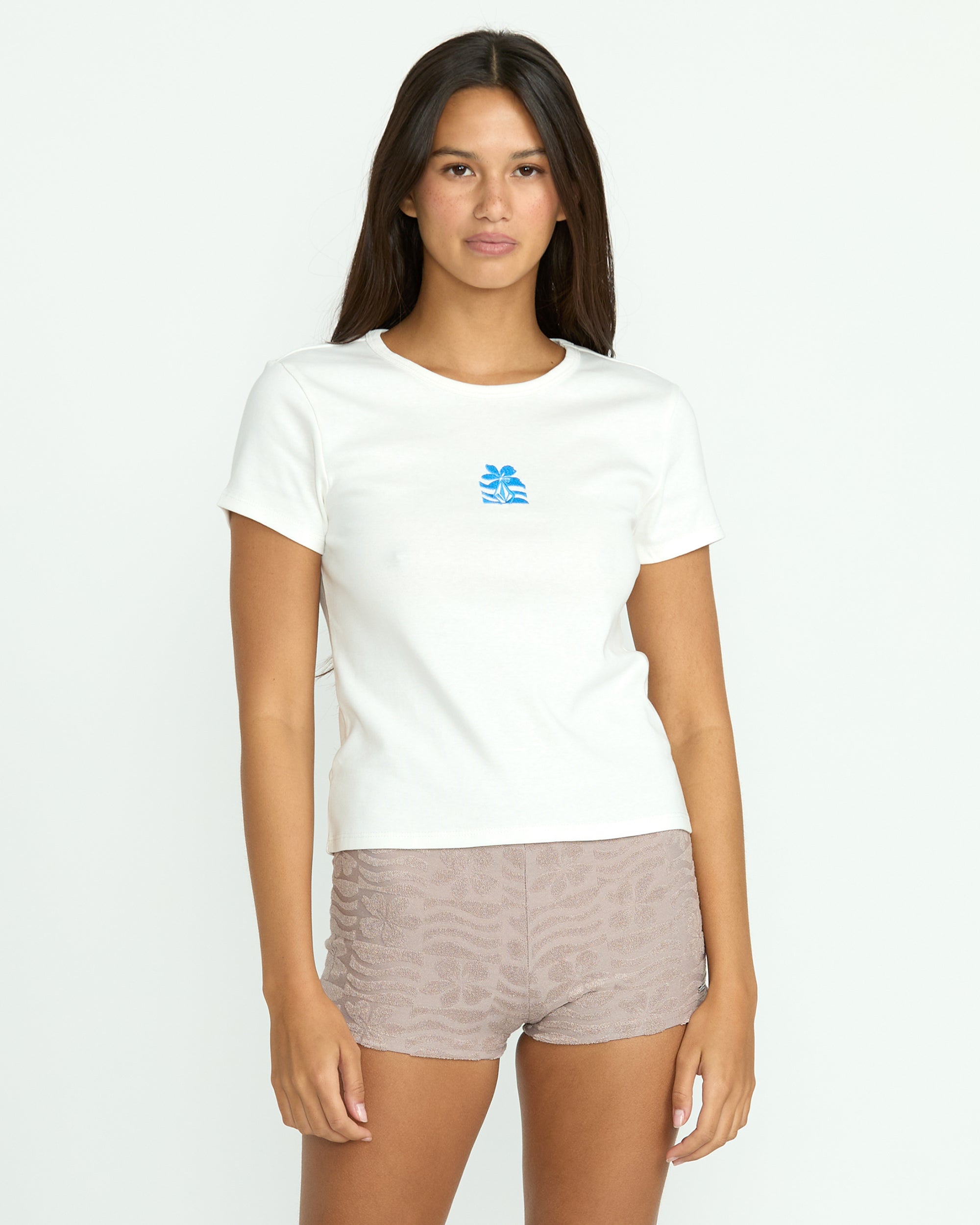 Organic cotton jersey hugs every curve in this fitted baby tee. featuring a stylish interior neck print. embroidered chest accent. and short sleeves to stay flirty yet comfy.