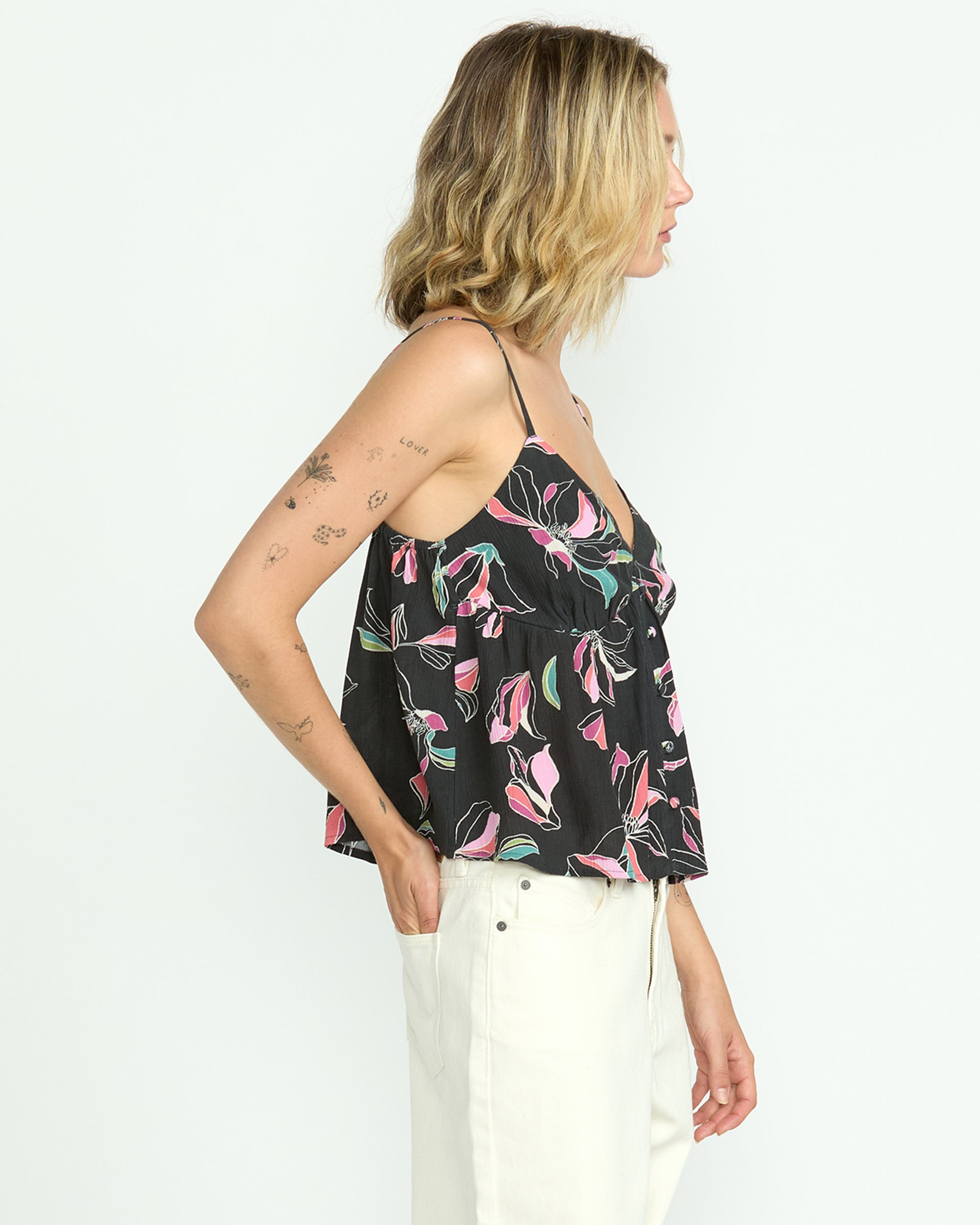 Breezy viscose gauze cami with adjustable straps. flirty floral print. and flattering triangle cups. Elasticized back waist opening and button-front placket for effortless style.