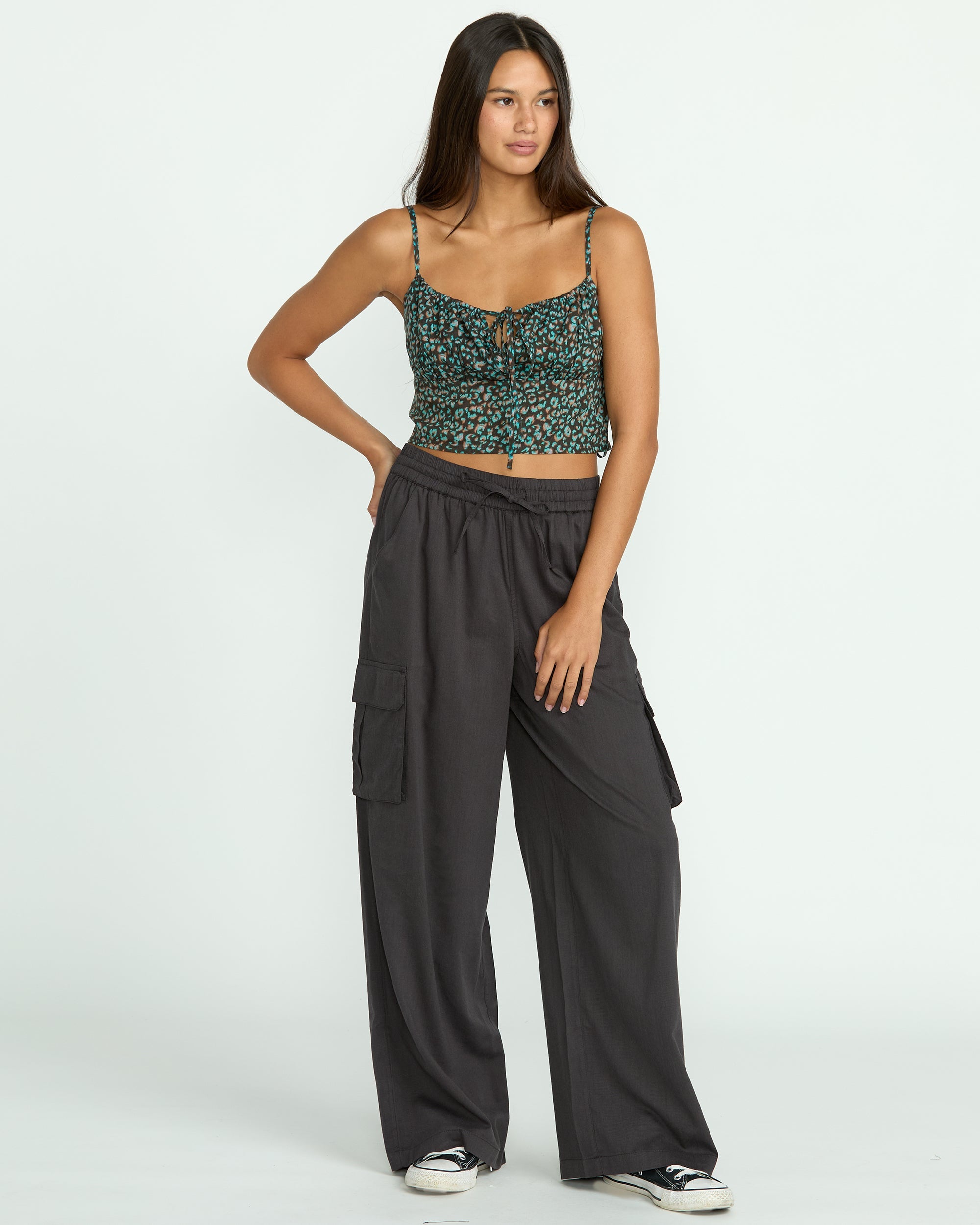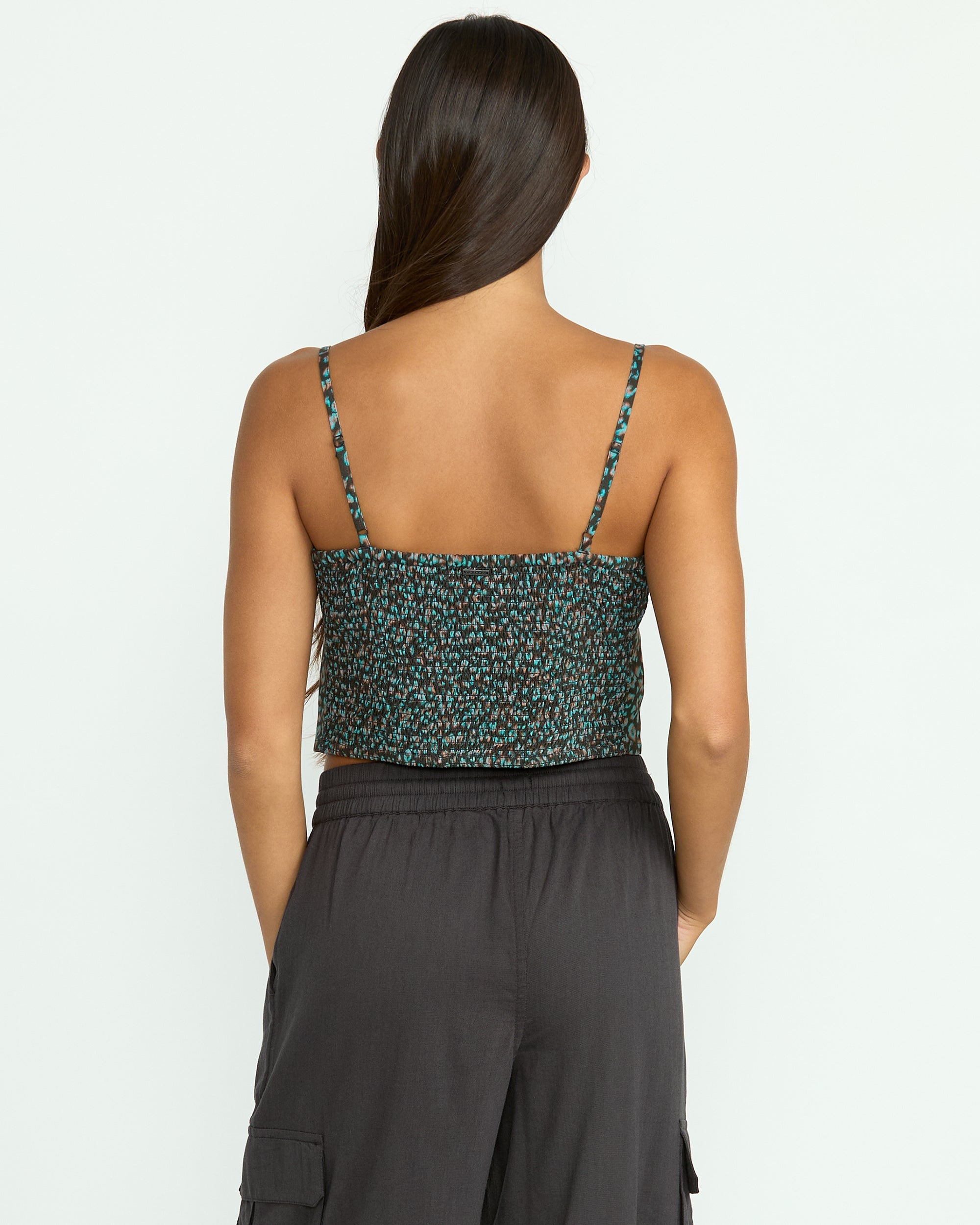 A viscose cami with sultry fitted shape enhanced by a smocked back. adjustable spaghetti straps. and keyhole neckline with drawcord tie. Allover print pattern ups the flirt factor.