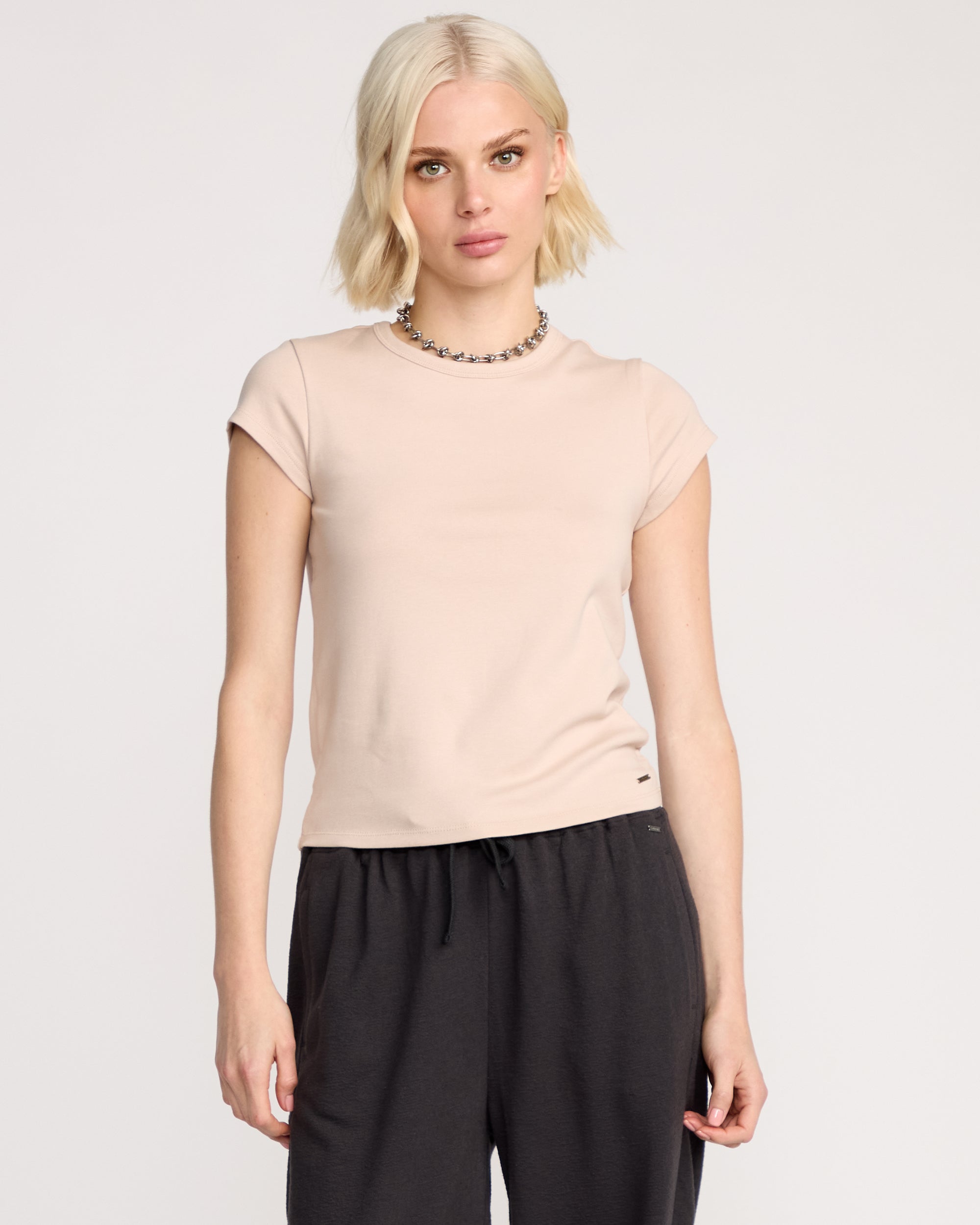 The Lived In Baby Tee in Khakiest is soft. stretchy 1×1 rib with a substantial feel. built for couch-to-curb comfort. Short sleeves. a clean rib neck. and a subtle metal badge keep it classic; the 21-inch length pairs with anything. Part of our Lived In Lounge collection. made to wear on repeat.