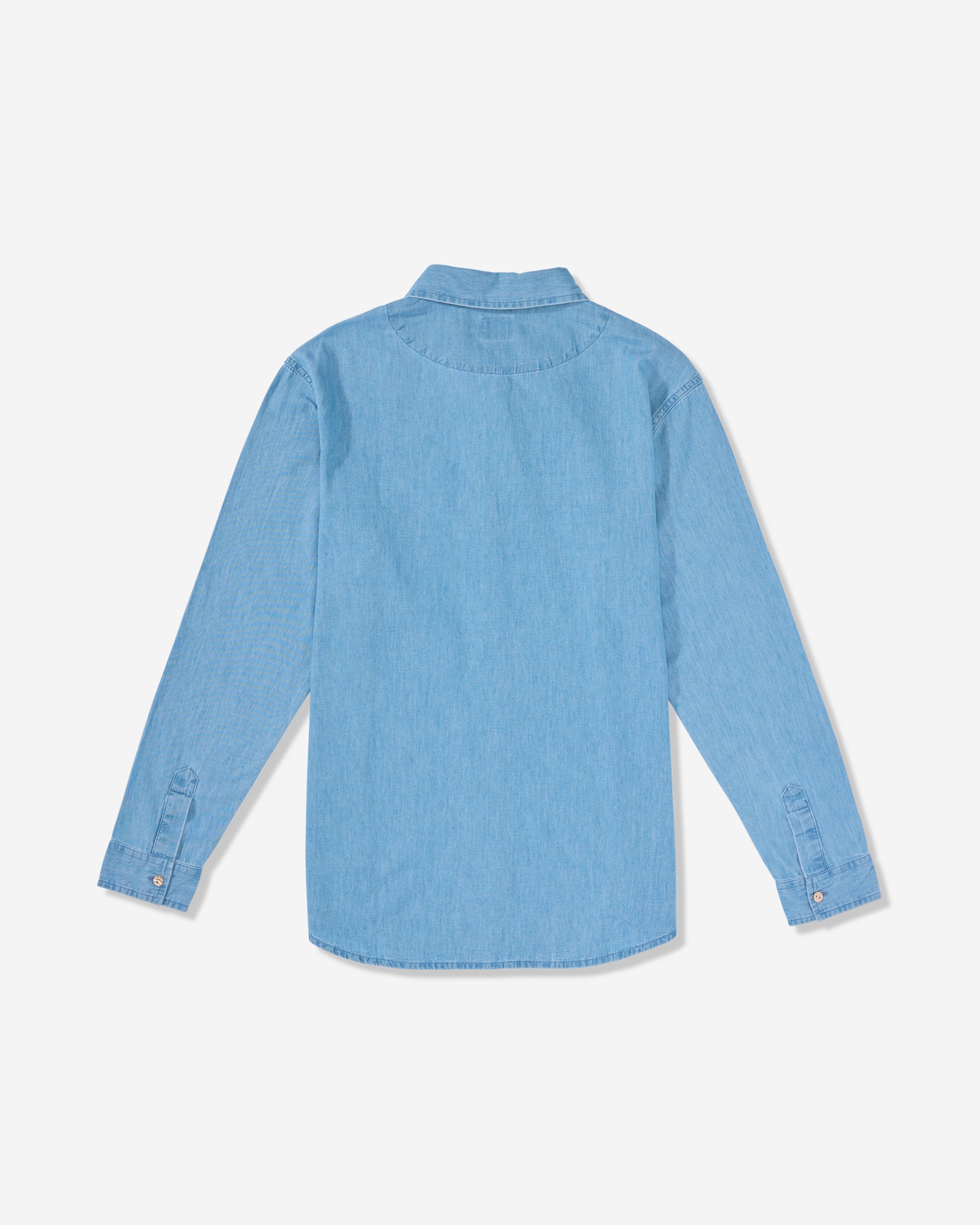 Quit stealing his; this chambray is yours. From our Lived In Lounge collection. the Lived In Button Up is cut oversized in 100% cotton chambray with a scalloped high-low hem that swings just right. A dropped chest pocket with metal badge. classic collar and button cuffs keep it clean. comfy and down for couch hangs or city runs.