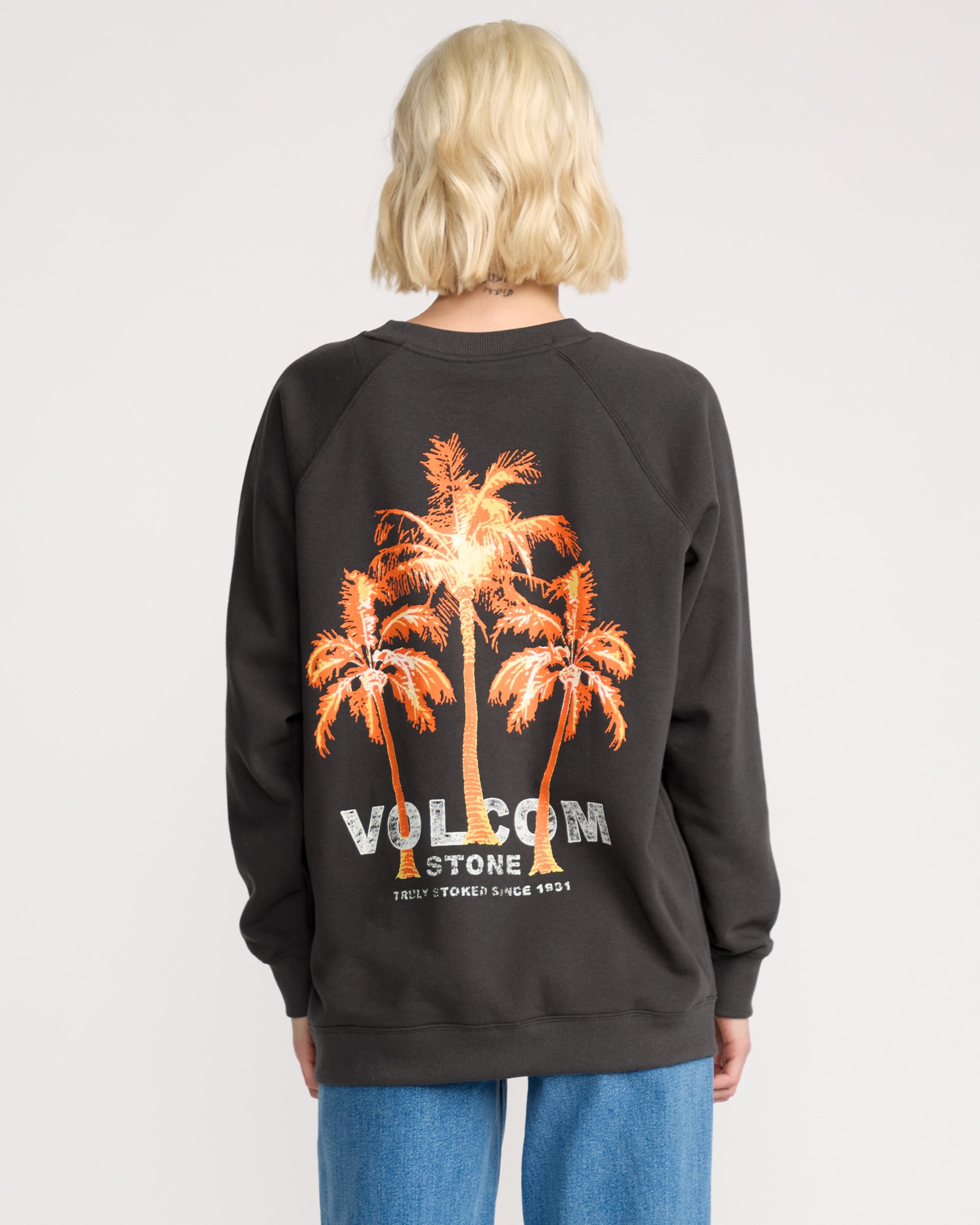 The Stone Magic Crew casts a soft spell in vintage black with brushed-back fleece that feels unreal. Raglan sleeves and a relaxed boyfriend crew neck keep it easy. while bold screenprints hit front and back. Your new sweatshirt for parking-lot hangs. dawn patrols. and last‑minute missions.